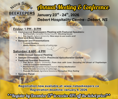 We regret to inform you that the Nova Scotia Beekeepers Association (NSBA) Healthy Hives session, originally scheduled for July 25-26 at Acadia University, has been cancelled due to low registration.
