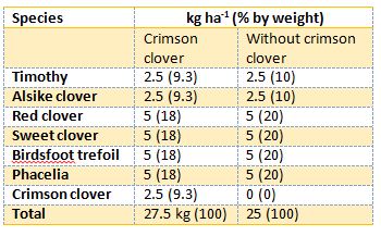 The seeding rate is 25 kg (1 bag) per hectare (2.5 acres). In order to get the best results, it is important to plant the mix in the spring. The Phacelia blooms in the first summer, followed by the crimson clover in the late summer and the sweet clover blooms the following spring/summer. Alsike clover, red clover and birdsfoot trefoil should continue to bloom for several years.
